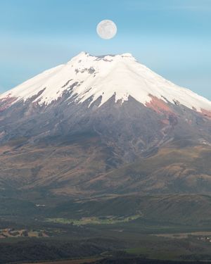 Full moon rising over Ecuador's iconic Cotopaxi Volcano
